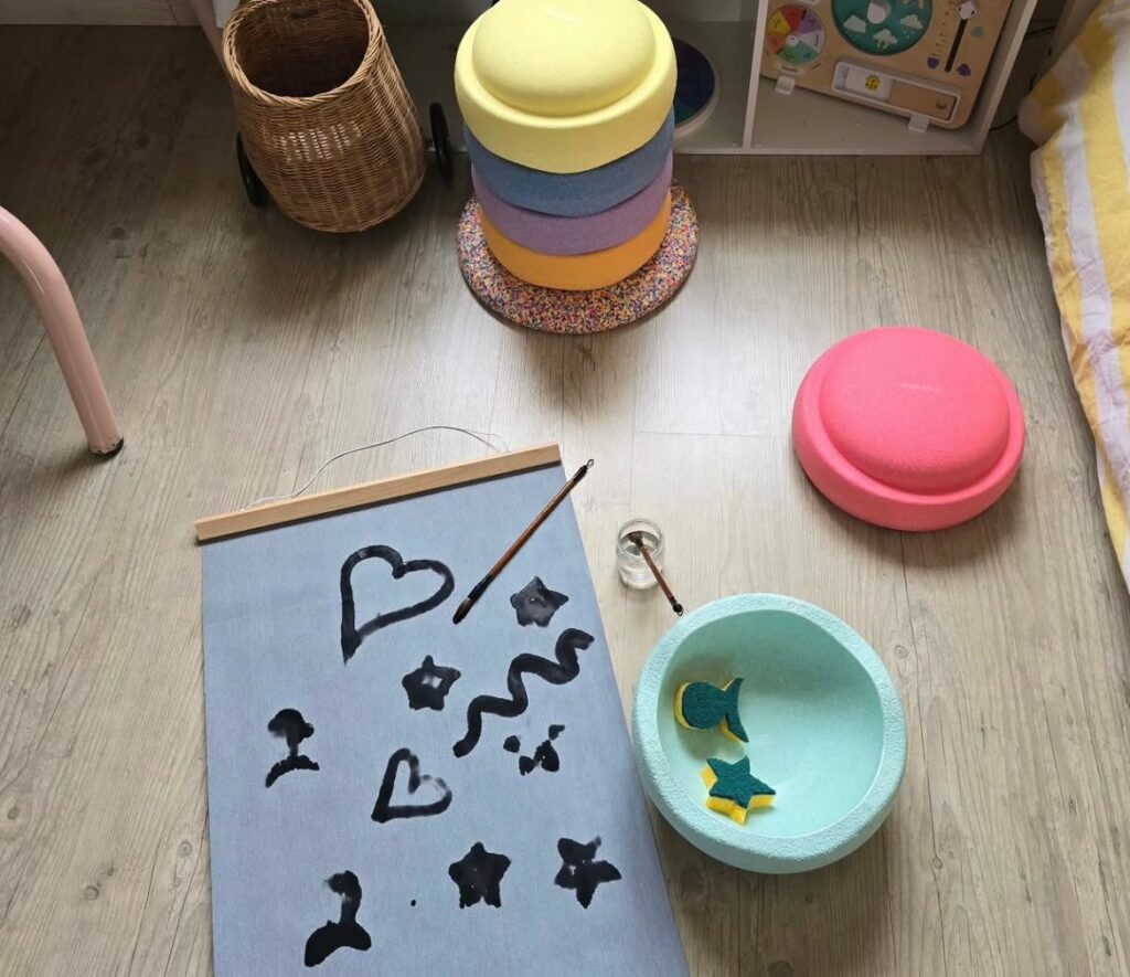 Ce concept ingénieux permet aux enfants de peindre avec leurs doigts, des tampons ou des outils doux, sans se salir.